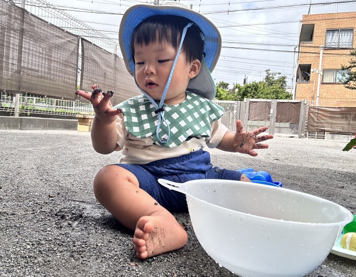 室内でも園庭でもお水遊びを行い、びしょ濡れになりながら、冷たい感覚を気持ちよさそうに楽しんでいます。