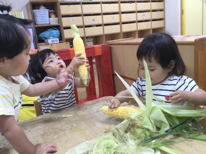 食育では、トウモロコシの皮剥きを行い、夏野菜にも触れました。