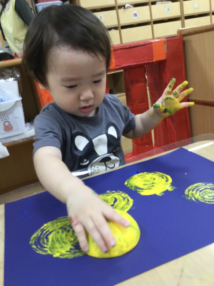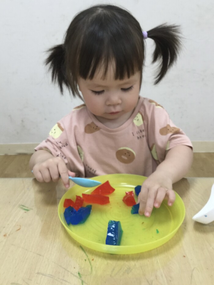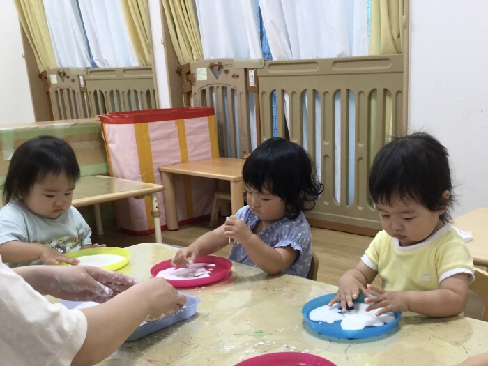 また、絵の具、片栗粉粘土や寒天遊びなどの感触遊びも