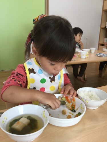 こ~んな風に汁物を飲むときには下から両手で支えながらも食べている姿も見られますよ?気を抜いていたりすると片手持ちになってしまいがちですが・・・?幼児クラスになるに向けてこういった小さな部分から持ち方や使い方の習慣をつけていけたらと思います✨?