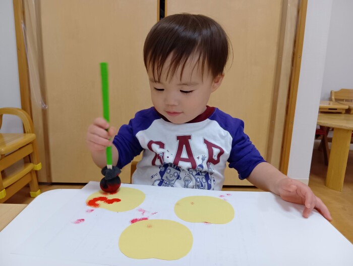 秋の果物といえば、りんご!真っ赤なりんごの製作をしました。手やたんぽに絵の具を付けて、画用紙に色を付けていきます。手で画用紙を叩くようにしたり、たんぽをぎゅっと握ってポンポン押したりして、自由に色を付けることを楽しんでいました。