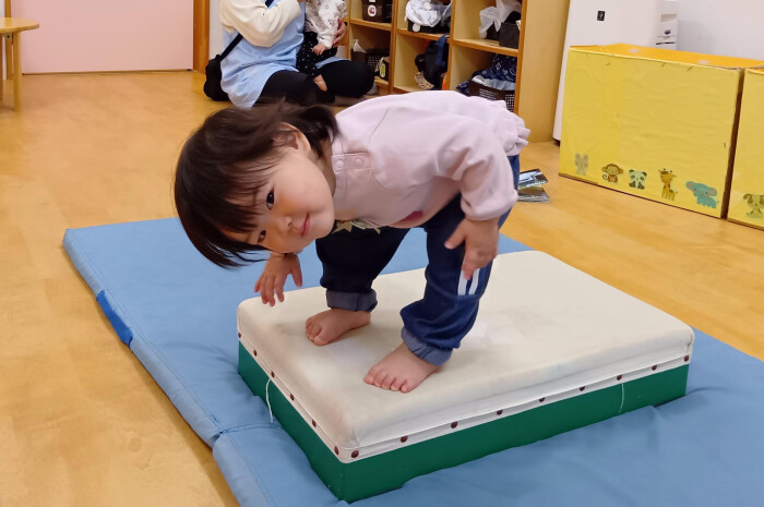 お部屋で運動遊びをしました。巧技台やマットを使って、段差を昇り降りしたり、はいはいで進んでいた子どもたち。全身を使って遊んでいます。