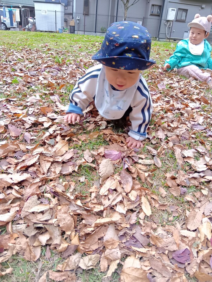 落ち葉の上を歩いたり、触ってみるといい音が・・・! ぱりっという音に気づいたお友だちは、何度も繰り返し踏むことや、にぎにぎと握ることを楽しんでいましたよ。どんぐりも保育者と一緒に触ったり、じっくりみてみたりしていました。