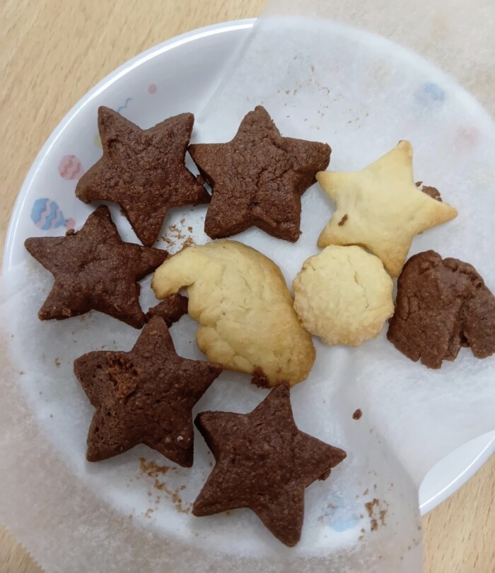 ココア味の黒い生地とプレーン味の白色の生地が配られ、各々が混ぜたり、重ねたり、型どったり、、、好きなようにクッキングしていきました。自分の食べる分を、自分で作っていくのですが、何度も何度も形を変えられバターがすっかり溶けて柔らかく柔らかくなっていく生地達、、、そんな心配を吹き飛ばすように焼き上がったクッキーはとってもいい匂いとサクサクとしたいい音をしてくれました。