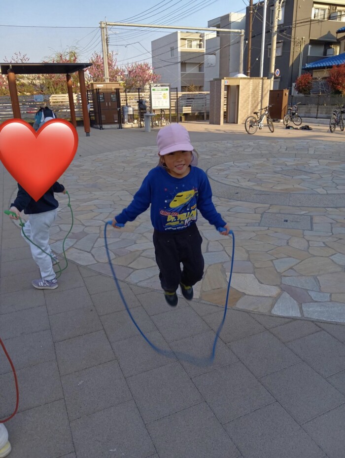 それを見ていた子も「お手本になれるように頑張る!」と83回も跳べて、やる気、意欲に保育士も背中を押された一コマでした!