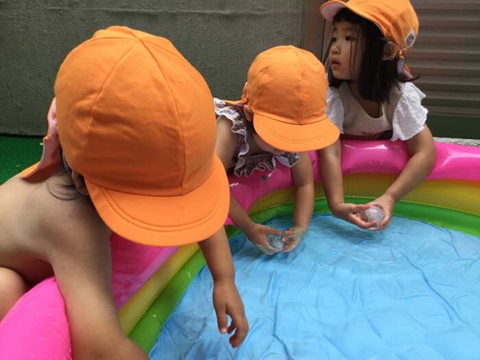プールに氷をプカプカ浮かべて遊んだり、溶けて小さくなっていく様子を観察。