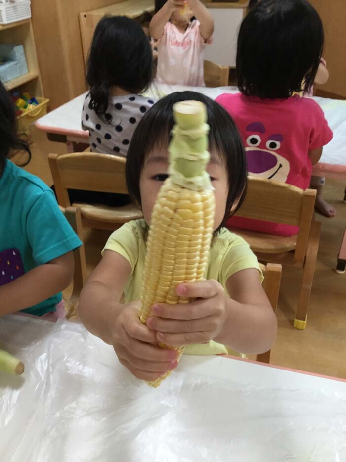 7月の食育“玉ねぎの皮むき“に続き…とうもろこしの皮むきに挑戦しました🌽