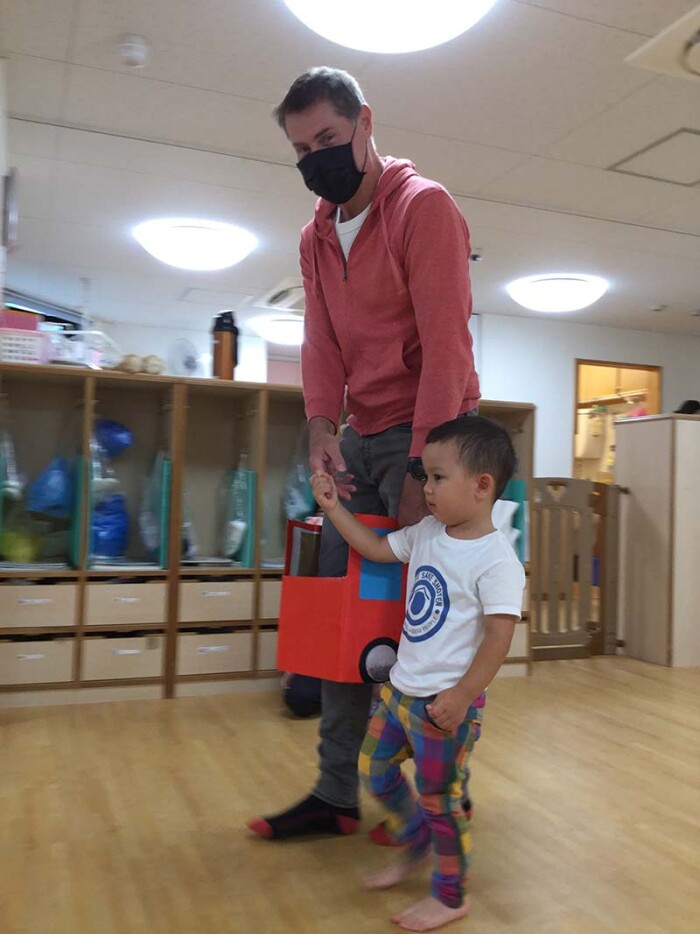 最後はバスごっこ!保護者の方と一緒にミニミニバスに乗って出発です!
