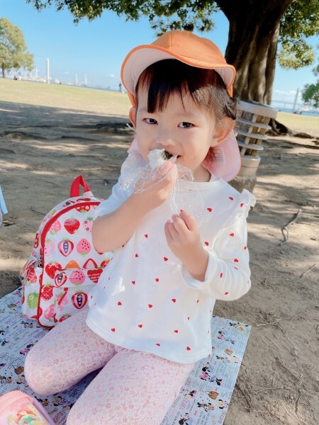 リュックから嬉しそうにおにぎりを出して準備し、「見てみてー可愛いでしょ」