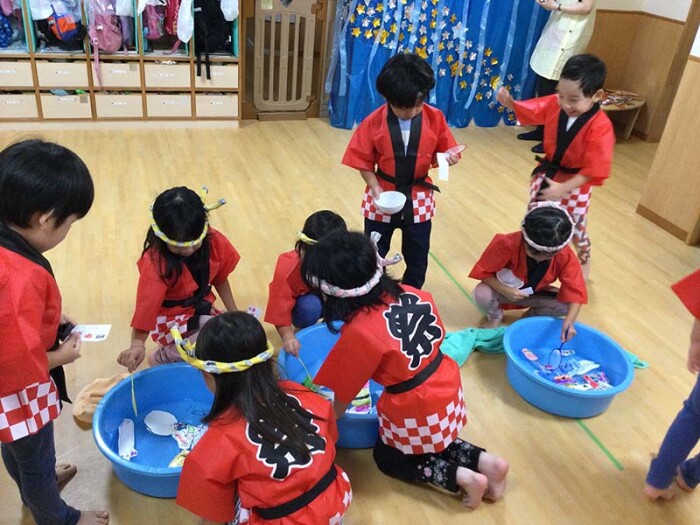 お客さんが来たら、さかなつりのポイ手渡すところから、「ここ良いよ」と空いているタライへ案内、