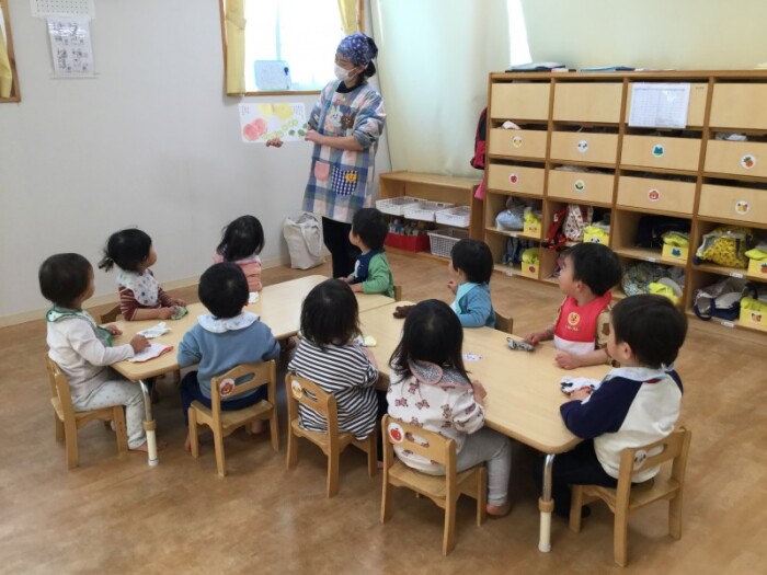 ひよこ組、りす組さんは「サンドイッチでんしゃ」という絵本を読んでから、